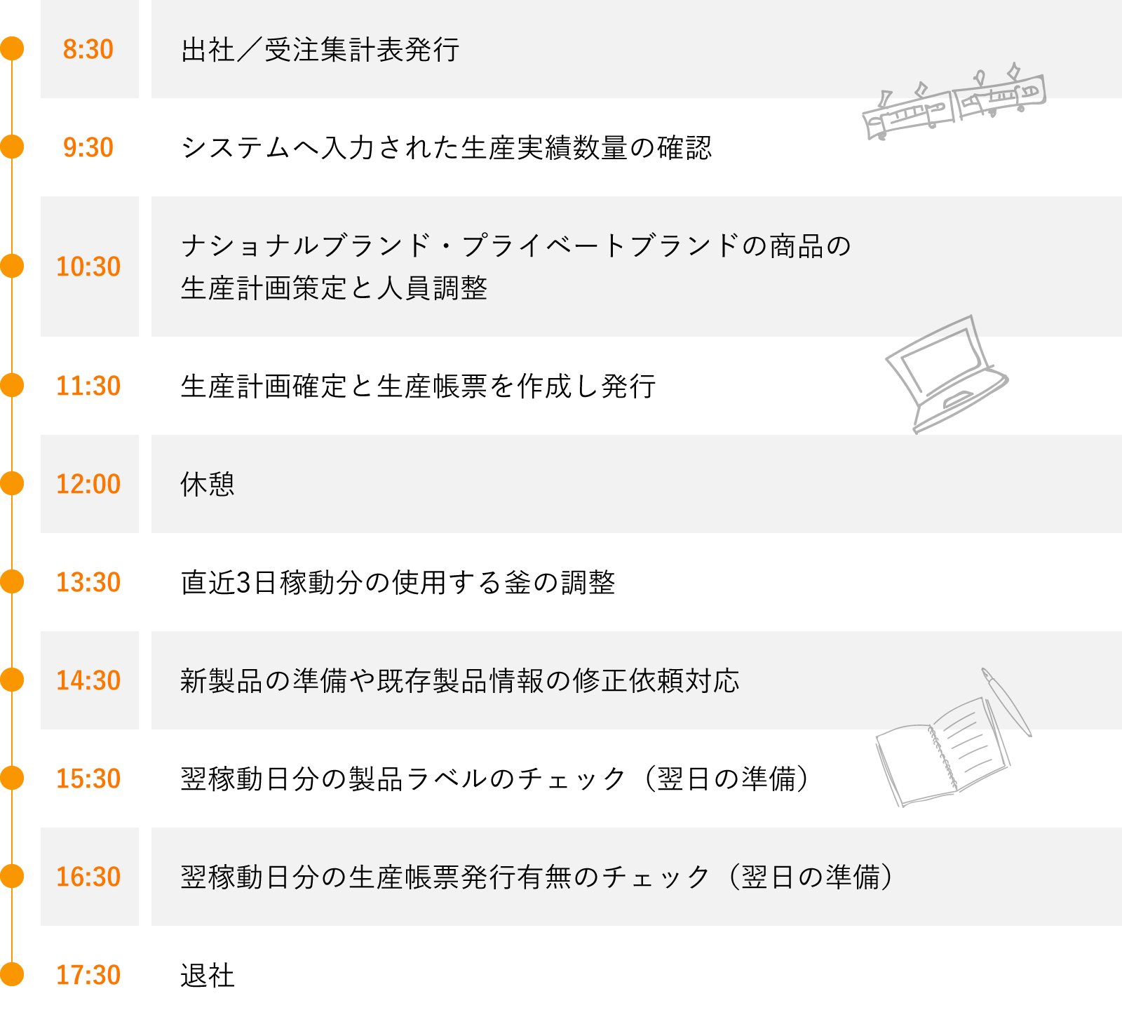 生産管理は生産の計画を立て、そのための人員を調整する仕事になります。いかにミスを無くせるか、効率よく行なえる方法はないかなどを考えながら仕事ができる余裕ある職場だと思います。
