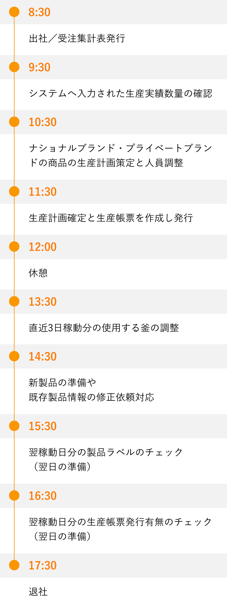 はじめは工場で働くことも考えましたが、どういった流れで食品を作り、それをどのようにして世の中に供給しているのか、その部分に興味があったので、製造職を希望し現在、食品製造の流れを計画する生産管理の仕事をしています。